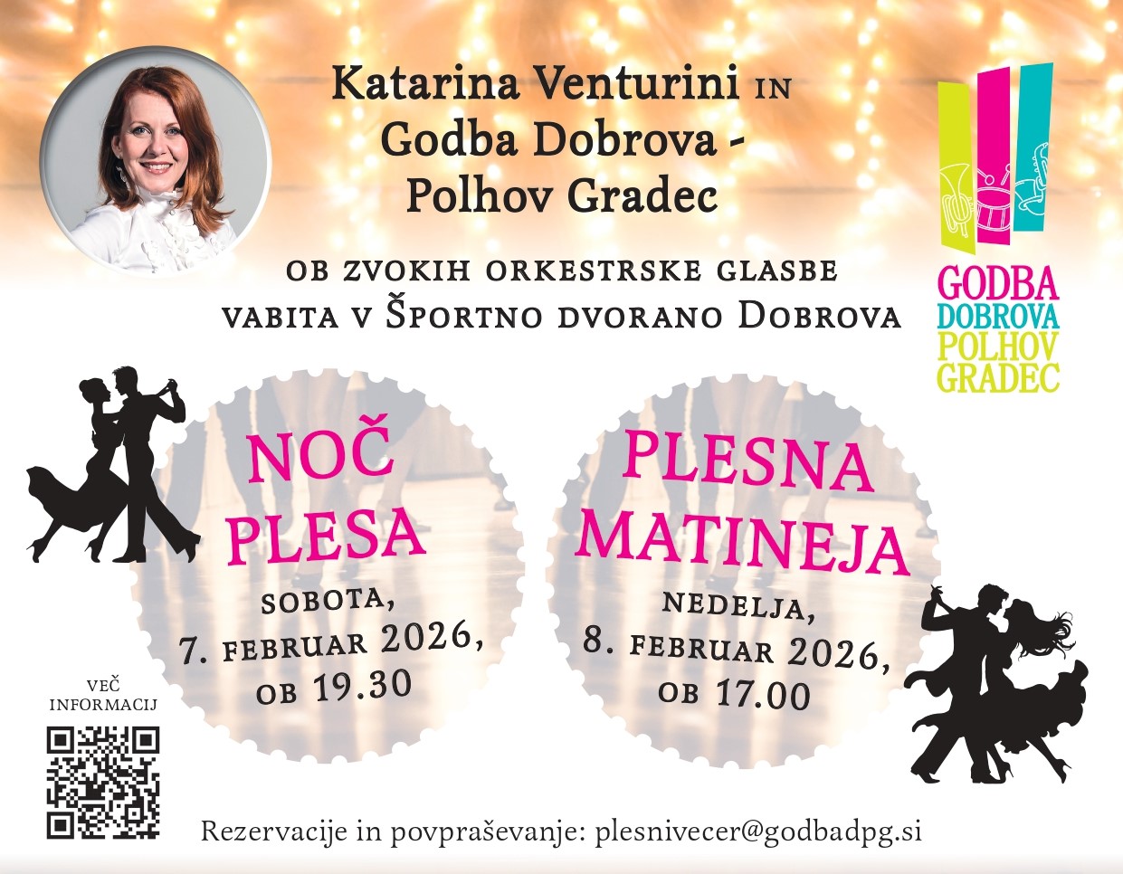Športna dvorana Dobrova Cesta 7. maja 20, 1356 Dobrova,Dobrova,Slovenija,SlovenijaLetos bomo imeli kar dva večera plesa! Prav ste prebrali. Kar dva! Prvi bo Noč plesa, ki bo celo noč. Celo noč bomo igrali🎶, plesali💃, jedli🍕 in pili🥂. Tudi letos bo tam tudi neverjetna Katarina Venturini. Vabljeni tudi vi, da se nam pridružite na tem plesnem popotovanju in živo glasbo. Spremljajte nas na družbenih omrežjih...