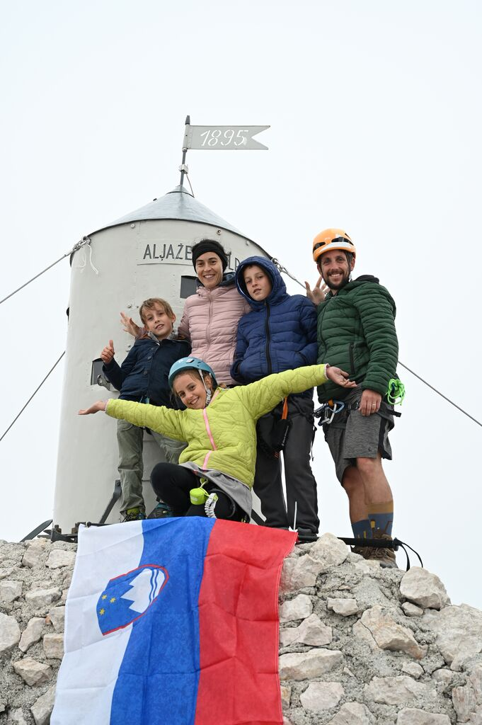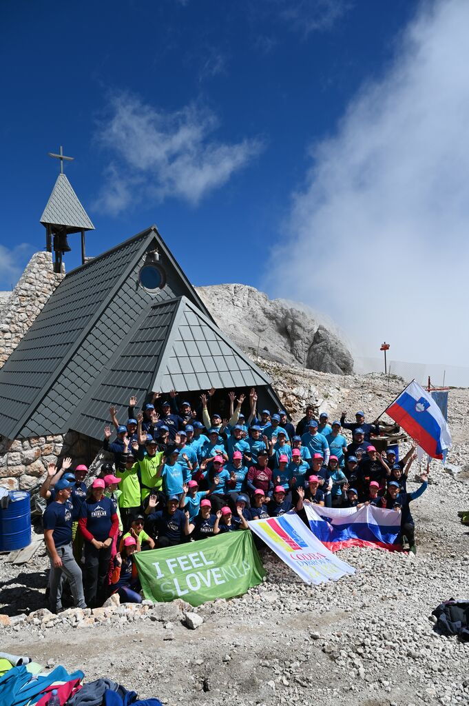 V slabih dveh urah je vseh 65 pohodnikov varno prispelo do Aljaževega stolpa. Najprej nekaj pesmi na kitaro, nato pa je zazvenela godbena slovenska glasba, ki je čudovito odmevala daleč v dolino. Sledil je tudi krst novih pravih Slovencev, ki jih je bilo letos kar 20! Sledilo je še fotografiranje družin in prijateljev in že je bil čas, da se odpravimo nazaj do koče na Kredarici.